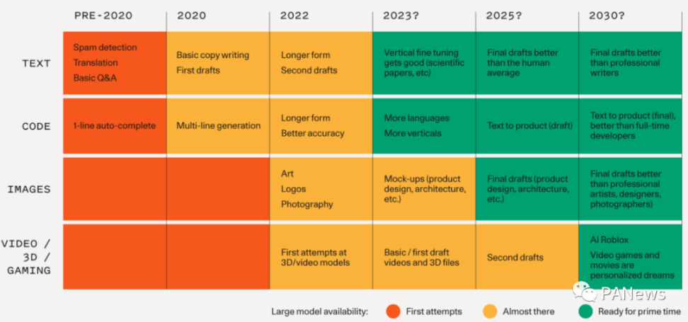 红杉资本在最近的研究报告中也指出,到 2030 年文本、代码、图像、视频、3D、游戏都可以通过 AIGC 生成,并且达到专业开发人员和设计师的水平。