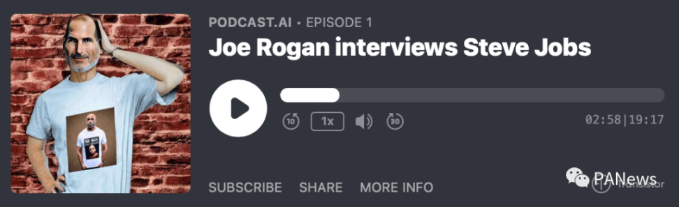 在 AI 生成音频方面,10 月 11 日,AI 播客 Podcast.ai 生成的一段关于乔布斯和美国知名主持人乔·罗根之间的 20 分钟访谈播客在科技圈广为流传,在播客中乔布斯谈到自己的大学时代、对计算机、工作状态和信仰的看法,整个播客听起来毫无违和感,基本做到以假乱真。