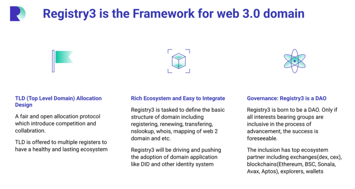 而近期出现的新项目 Registry3,正在致力于这套新规矩的构建:打造一个能够促进 Web3 公平和开放的域名分配框架,并通过完整的内部工具包来加速 Web3 域名的大规模应用。