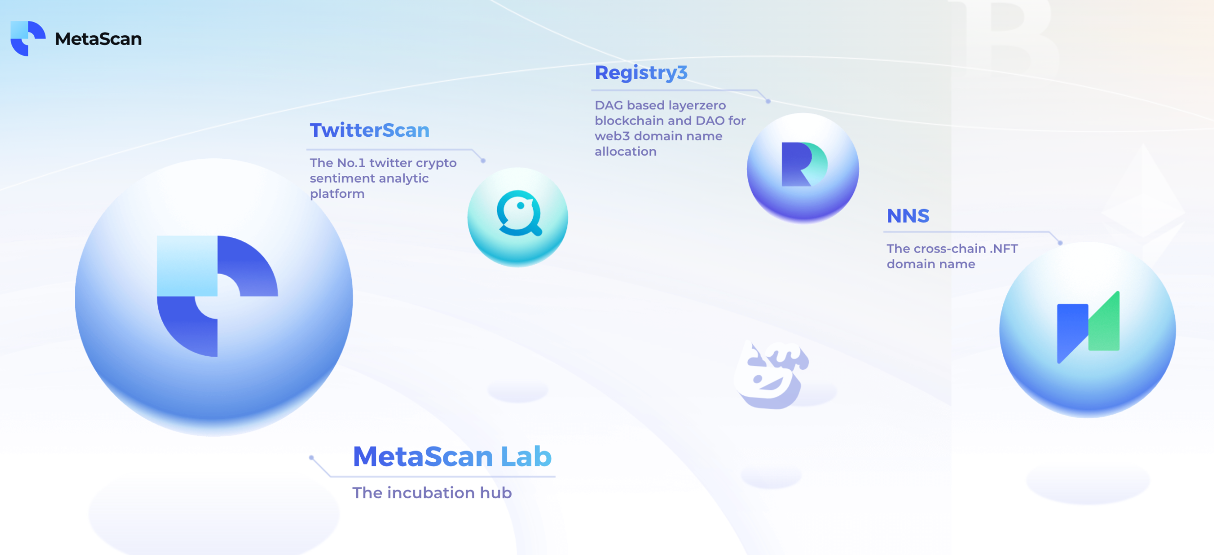而为 Registry3 提供背后支持的是 MetaScan。在此之前,MetaScan 曾经孵化过两款产品:分析加密行业社交媒体趋势的工具 TwitterScan,以及跨链域名服务 NNS(NFT Name Service)。