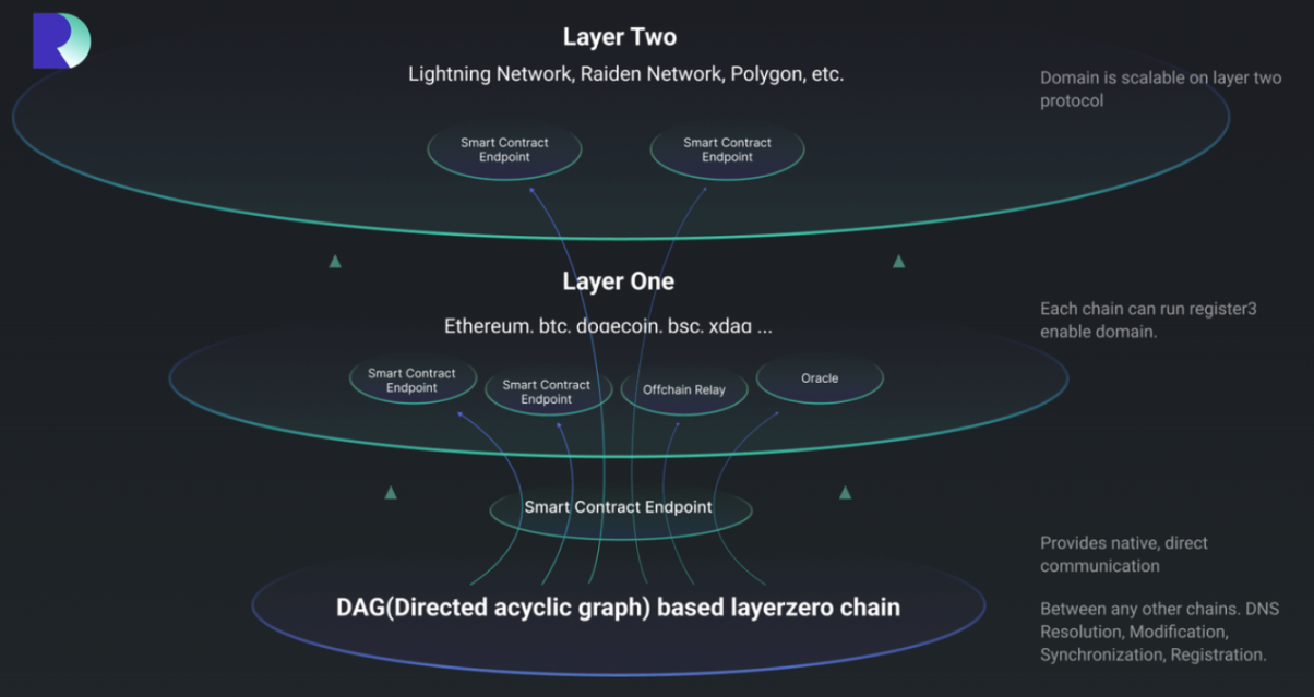 而这条域名链则更偏 L0 的位置,向其他的 L1 们提供域名注册、调节和协同等服务;同时任何 L1 区块链都能运行 Registry3 来启用其提供的域名服务,并且也能扩展延伸到 L2 上。