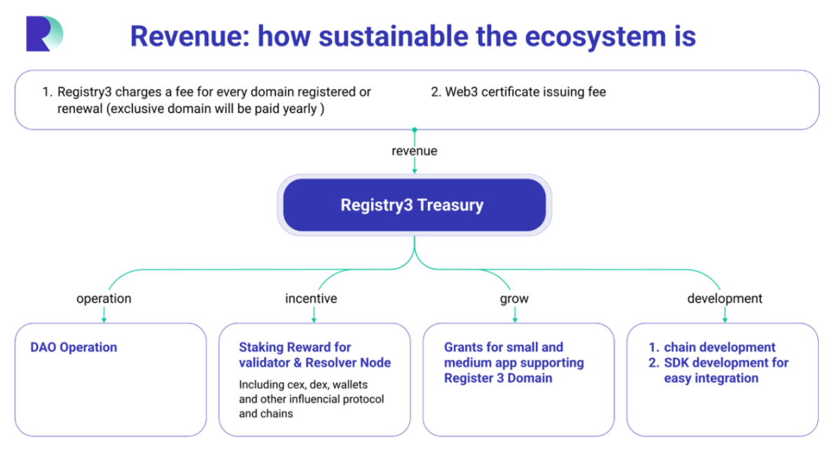 在链和节点的设计下,Registry3 形成了一个较为清晰的生态建设路线。域名的注册、更新以及证书服务所产生的收入,除了覆盖自身 DAO 的运营和开发之外,也会分给节点,用以激励其维护链的稳定运行;同时部分费用也会用来扶持中小型 Dapp,促进其支持 Registry3 的域名服务。