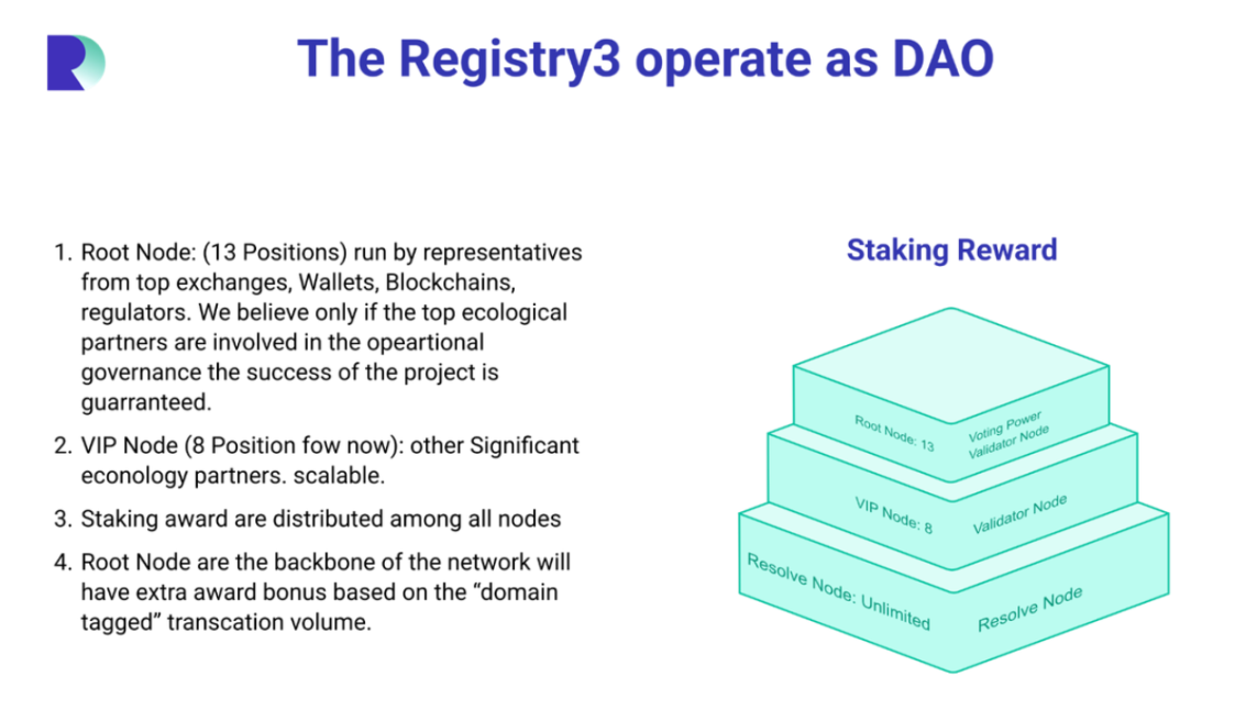 在节点设计上,Registry3 采用了开放的分层模式:与域名利益相关且规模较大的组织,如顶级交易所、钱包、其他公链代表和监管者等,作为根节点来维护链的运行;其他重要的生态伙伴作为 VIP 节点加入,而任何其他感兴趣的人也可以作为节点加入到 Registry3 中,承担节点的角色,并共同分享质押收益。