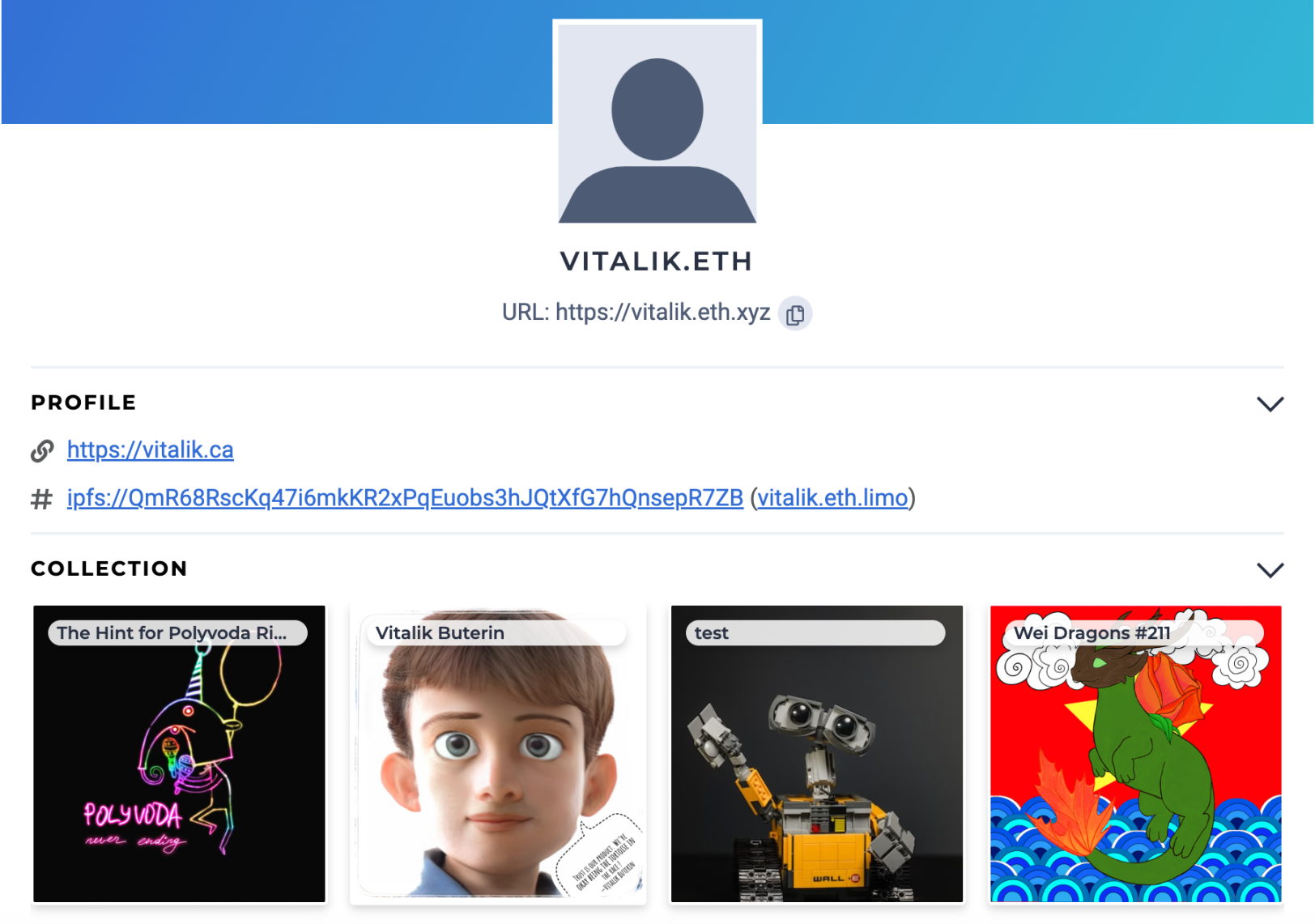 但它的出现,为用户克服链上地址的不便创造了可能,转账出错的概率得以降低,同时自己注册 ENS 域名也能够展示个性,并且形成了类似个人主页的聚合功能:你可以在一个 ENS 域名下的网页中关联自己的各类社媒地址和资产。