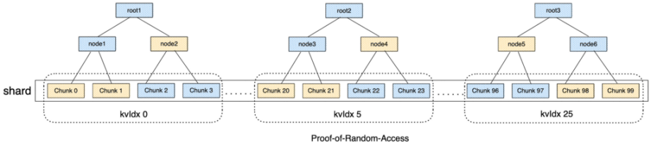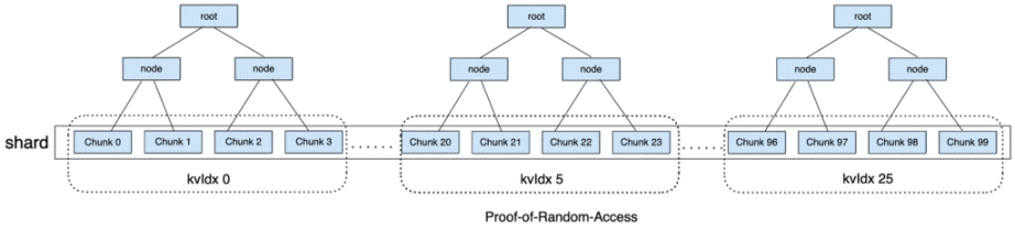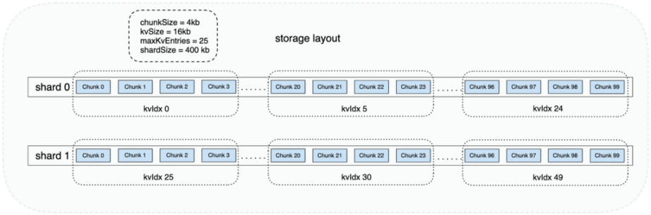 分片 (shard) 的存储格局我们上文已经介绍过了,在写数据的时候,会为每个 key 对应的所有 chunk 构造一个默克尔树,并且会将这棵树的树根存储在合约中。