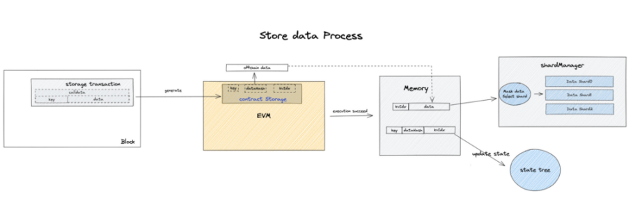 当整个区块完全执行成功的时候,验证者若同时运行验证节点和数据节点,验证节点会根据正常流程更新自己的世界状态 ( 更新世界状态的过程中也在合约账户内更新最新存储的 key,data,dataHash),然后数据节点会将内存中要存储的原数据 (data) 根据分配的 kvIdx 存储到对应数据分片 (shard) 的对应位置上。( 根据 kvIdx 选择 DataShard 请见下文 )