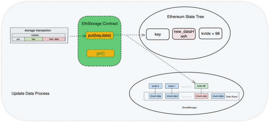 当用户需要更新存储在 EthStorage 上的数据的时候,依然是通过发起一笔以太坊调用合约的交易,来执行 put 方法: