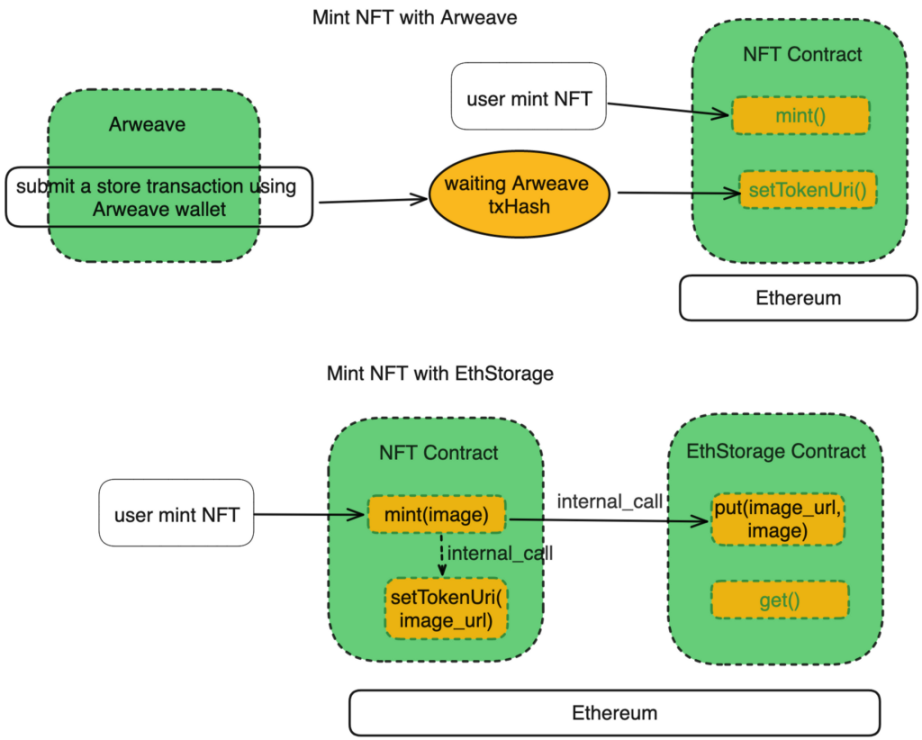 A 需要先通过 Arweave 的钱包创建并提交一笔存储图片的交易,然后在 Arweave 上等待这笔存储交易成功执行,并获取相应的交易哈希 (ar_image_txhash)。接着 A 回到以太坊上用以太坊的钱包创建一笔 mint NFT 的交易, 当这笔交易成功执行后, 再创建另外一笔 setTokenURI(tokenId , ar_image_txhash) 的交易来将 NFT 的 metadata 指向自己在 Arweave 上存储的图片。