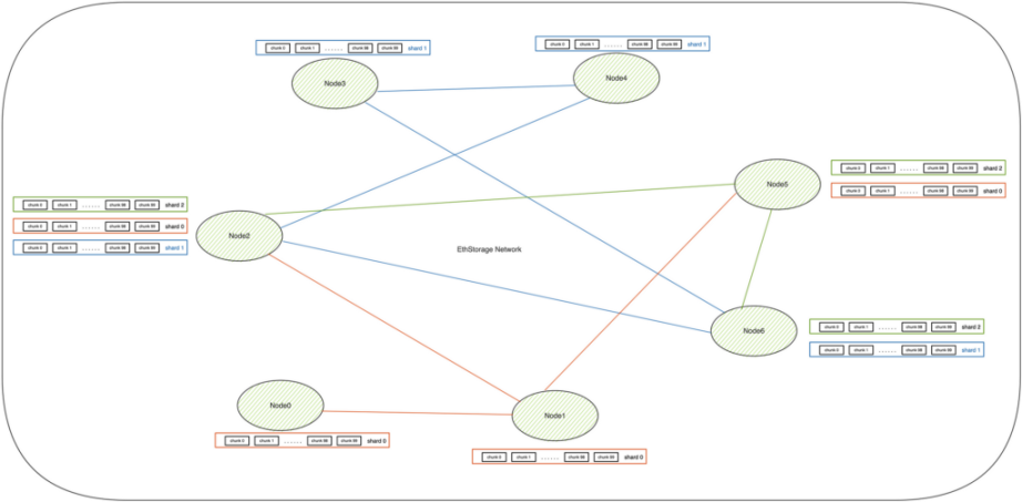 我们假设当前 EthStorage 网络一共有三个数据分片, shard0 , shard1,shard2, 同时每个数据分片 (shard) 被多个数据节点存储.