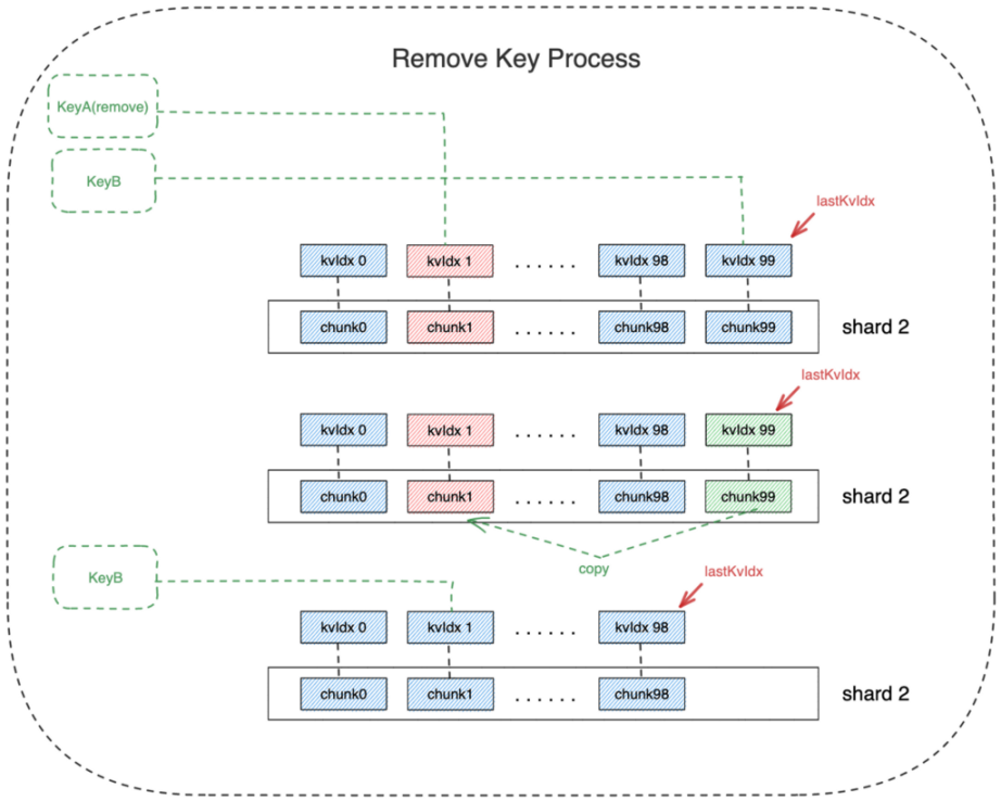 KeyA 对应的 kvIdx 为 1 ,用户此时要将 KeyA 对应的数据移除;当前最大的 kvIdx 对应的键为 KeyB。