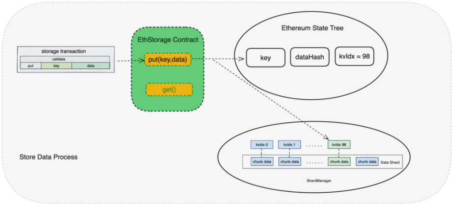 假设某个用户提交了一笔存储交易(调用 put(key,data) ),并且被当前的提案区块所包含,当这个区块中的这笔交易进入虚拟机 (EVM) 中执行并且执行成功之后;以太坊世界状态中会记录下 key 以及要存储数据 和该数据的数据哈希 (dataHash),同时给这个 key 分配一个 kvIdx。