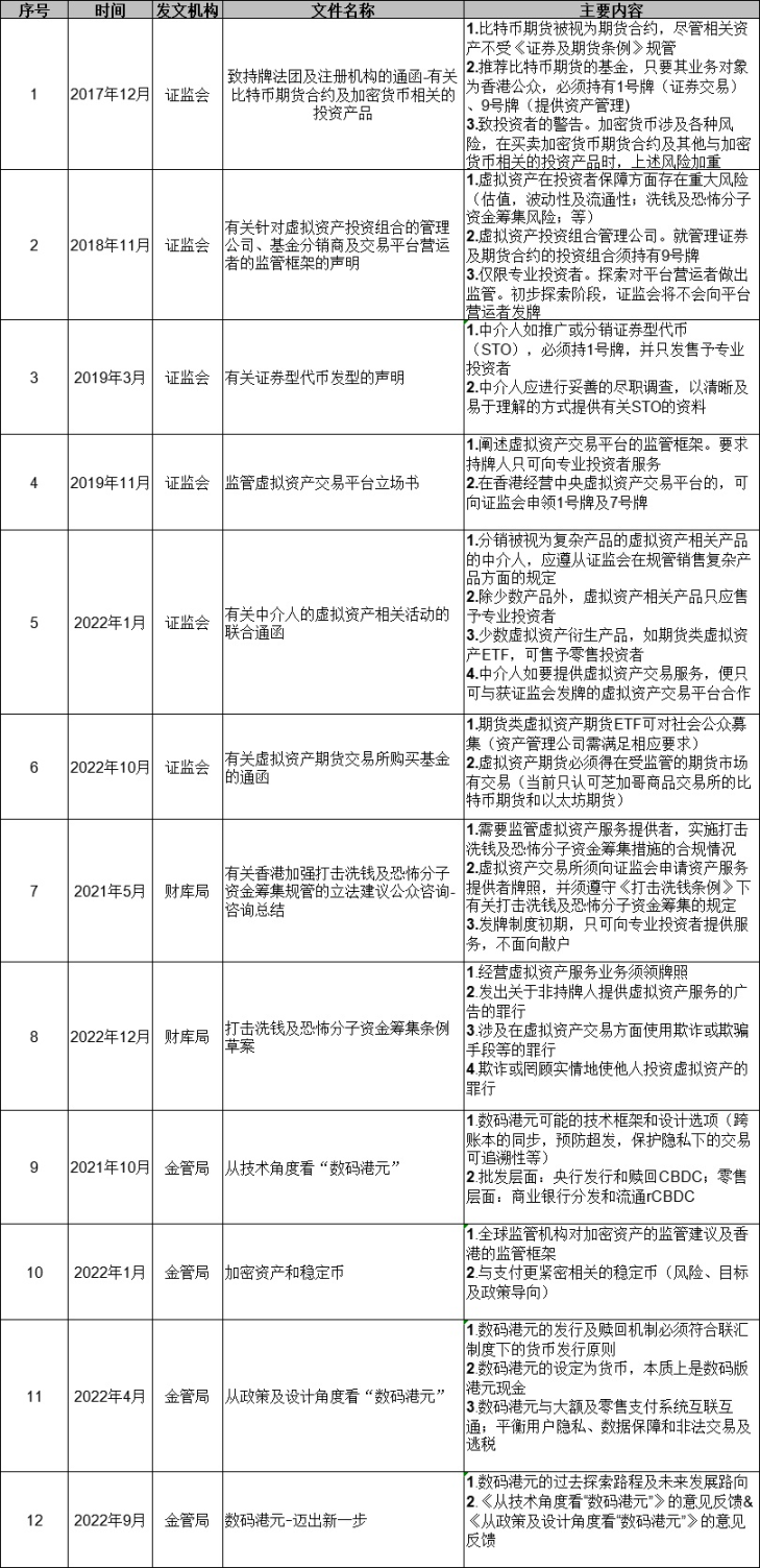 2022 年 10 月 31 日,财库局发出《有关香港虚拟资产发展的政策宣言》,宣言内容汇总了几家监管机构关于虚拟资产的最新观点。例如财库局(打击洗钱)、金管局(稳定币)、证监会(投资证券及期货;虚拟资产交易平台;证券类型代币发行 /STO)。宣言,顾名思义为表达对重大问题的立场、观点而发表的的文告。如果想正确理解宣言,把握香港虚拟资产发展的机会,我们有必要回顾近年来香港针对虚拟资产的主要政策文件。
