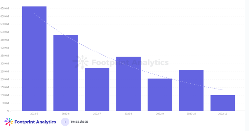 The total volume in GameFi more than halved. A large part of this was unusually high volume in October driven by the Axie Infinity unlocking event — with the market now coming back to its normal state.