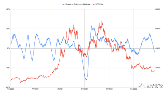 一般来说,哈希率随着时间的推移呈上升趋势。但是,也有 30 天增长为负的时期。哈希率在夏季崩溃后立即下降,然后最近由于 FTX / Alameda 的影响而暴跌。这再次证实了我们的理论,即当没有更多信贷可用于支付电费时,矿工将缩减运营规模。