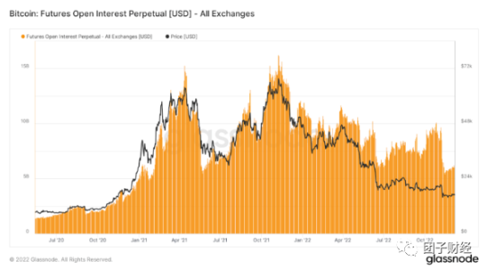 查看所有主要加密货币衍生品中心化交易所的 OI 总和,我们可以看到 OI 局部低点也与 11 月 14 日星期一比特币低于 16,000 美元的价格一致。现在,OI 回到了 2021 年初以来的最低水平。