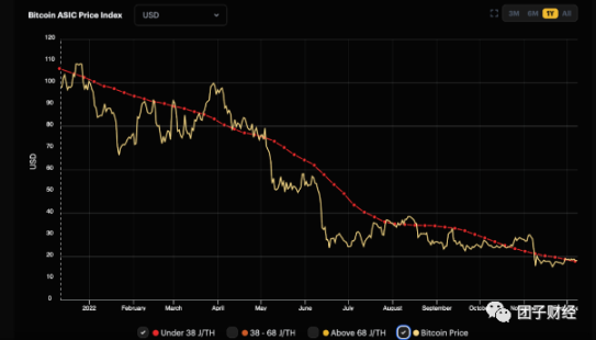 这是比特大陆 S19 或其他效率低于 38 焦耳 (J) / Terahash (TH) 的同类矿机的价格图表。正如我们所见,S19 的抵押品价值与比特币价格一起暴跌。想象一下,您借给这些钻井平台美元。你借给他们的矿工试图出售比特币以提供更多法定货币来偿还你的贷款,但最终未能如愿,因为边际利润率下降了。矿工们随后拖欠贷款并交出他们的机器——这些机器现在的价值比贷款时低了近 80%——作为偿还。