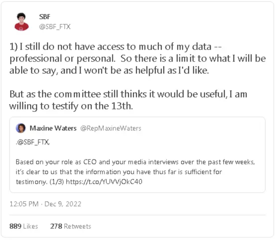FTX 前首席执行官 Sam Bankman-Fried 将于明天出席众议院金融服务委员会,回答有关 FTX 倒闭的问题。最近几周,SBF 一直在进行媒体巡回演出,讲述他的故事,真真假假不太清楚,仍有许多悬而未决的问题。预计委员会将询问其破产发生的过程,以及对此负有多大责任。在接受采访时,预计他将否认任何欺诈行为,但 SBF 将面临牢狱之灾。他今天还刚刚宣布,将“拜访”而不是去华盛顿,以避免“狗仔队效应”。嗯,也许躺在 Zoom 上更容易。小贴士:SBF 的父母自 1987 年以来一直在斯坦福大学任教,下学期将不会继续任教。