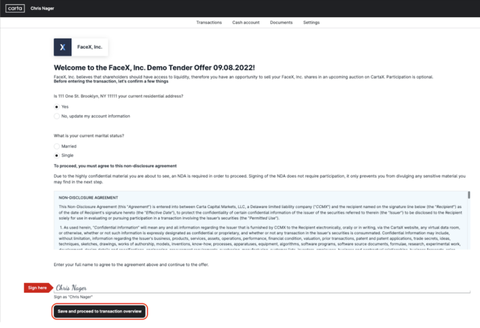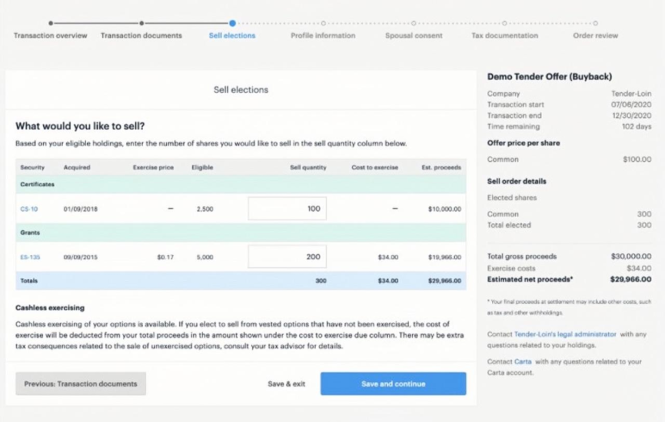 依托于 Carta 对于公司股权和投资者的管理能力,私人股票交易时需要的所有信息和文件可以直接在平台内生成、获取、并且安全地访问,然后轻松实现各类协议的在线签署。当客户在 CartaX 完成交易,所有的股权结构变动都会自动更新,并通知 GP 和 LP。Carta 的税务引擎和会计团队也会自动核算各种费用。