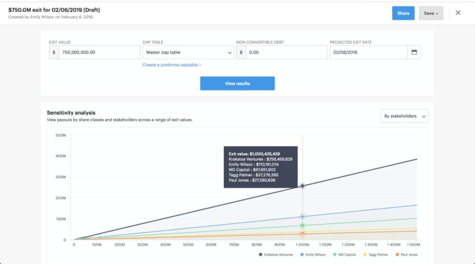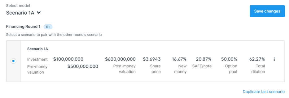 当公司计划进行新一轮的融资,可以使用 Carta 的情景建模功能来提前进行股权稀释分析和退出模拟,以帮助公司作出最佳的融资决策。