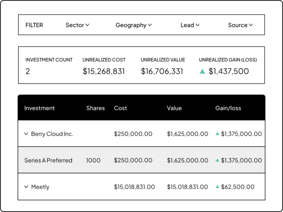 Carta 的基金仪表板可以实时显示最新的 IRR、TVPI、Gross Return 和整体基金业绩。投资机构无需再等待季度或更长周期的更新,也不用每次都花费大量时间和精力来收集和处理数据。