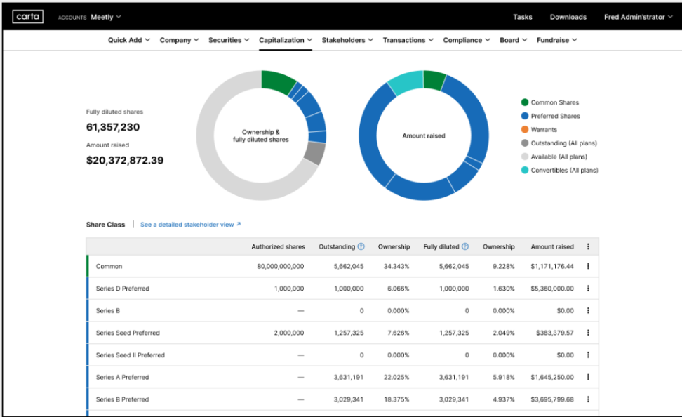 Carta 提供了简单且易上手的股权结构表模板。公司将股权结构输入到平台后,Carta 可以提供直观的图表展示,所有的利益相关者都可以根据相应的权限,登录平台查看最新状态的股权结构。更重要的能力是,每当股权发生变动,Carta 都会自动完成更新,并同步给所有利益相关者。
