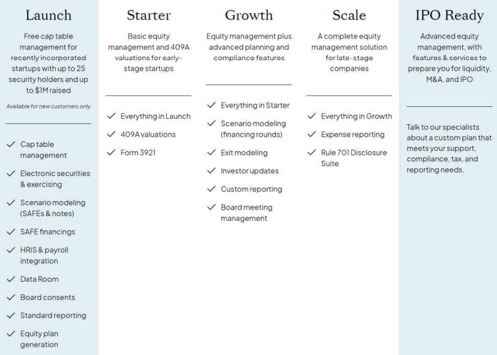 客户最初可以使用免费版本,Carta Launch,包含最基础的股权结构表管理功能,但是仅支持最多 25 个股东和 100 万美元的融资额。但是通常情况下,对于一些刚成立的创业公司,这已经是足够的,因为公司并不涉及过多股东,也可能还没有开始融资。