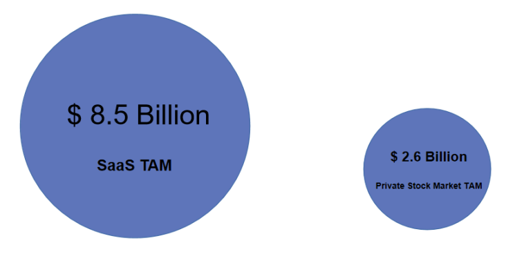 对于 Private Stock Market 的业务,根据 CBInsights 和 Pitchbook 的数据,2022 年全球范围内,5 亿美元估值以上的私人公司的市值总计为 44 万亿美金。假设周转率为 3.0%,相当于 1,310 亿美元的交易额。若 take rate 为 2%,那么 2022 年,Private Stock Market 的 TAM 测算为 26 亿美元。