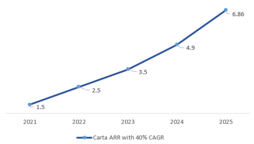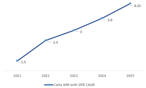 假设 ARR 以 20% 的 CAGR 保持增长,到 2025 年,Carta 的 ARR 将达到 4.3 亿美元,拿到 5% 的 Market Share。