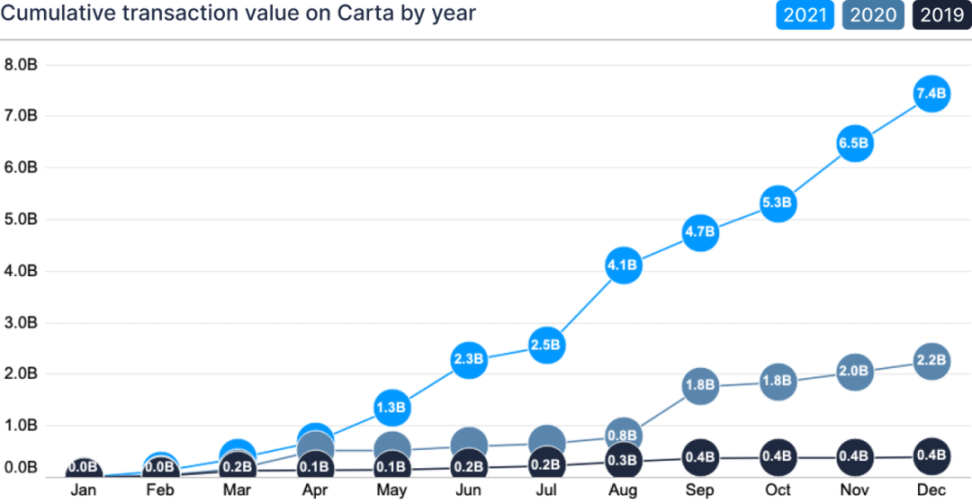 2021 年,在 CartaX 上完成的 Private 股票交易,交易额超过 70 亿美元。