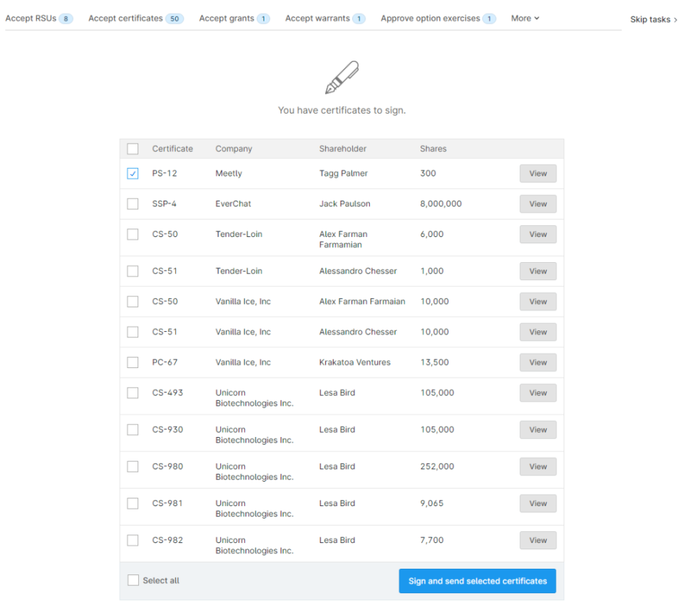 公司可以快速且简便地通过 Carta 发行各类电子证券,包括股票、可转换债券、SAFEs、认股权证、RSU 等。股东可以通过在线平台完成协议签署,所有的股权变更也会实时更新到股权结构表。