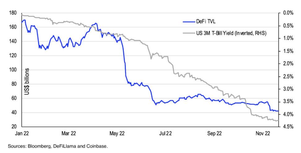 图 5: DeFi 中的 TVL 对比美国 3 个月期国债收益率
