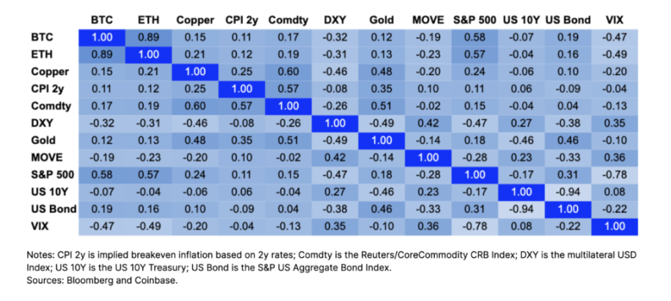 然而,从夏普比率的角度来看,纵观 2022 年,Crypto 的风险调整后回报,实际上与美国和全球股票指数表现一致,而且表现远好于美国债券。在 11 月份的崩盘之前,一个由 BTC 和 ETH 组成的等权重 Crypto 篮子的夏普比率为 - 1.08,而美国股市的平均回报率为 - 0.90。这与上一个 Crypto 冬天观察到的趋势有很大的不同,当时数字资产在 2019 年期间和 2020 年初的表现,几乎低于所有传统风险资产。