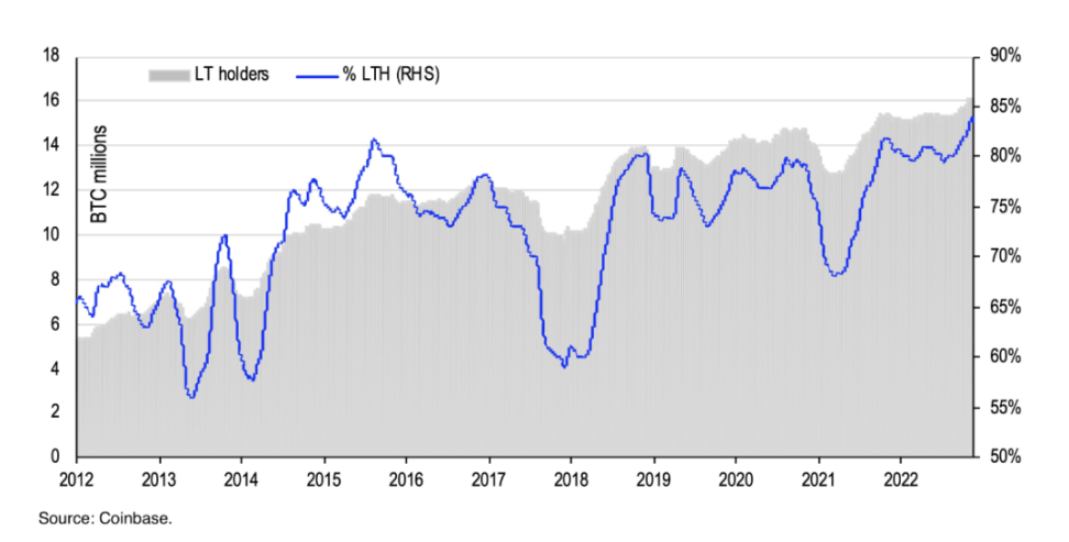 图 3: BTC 长期持有者的持仓占比达到了 85 %