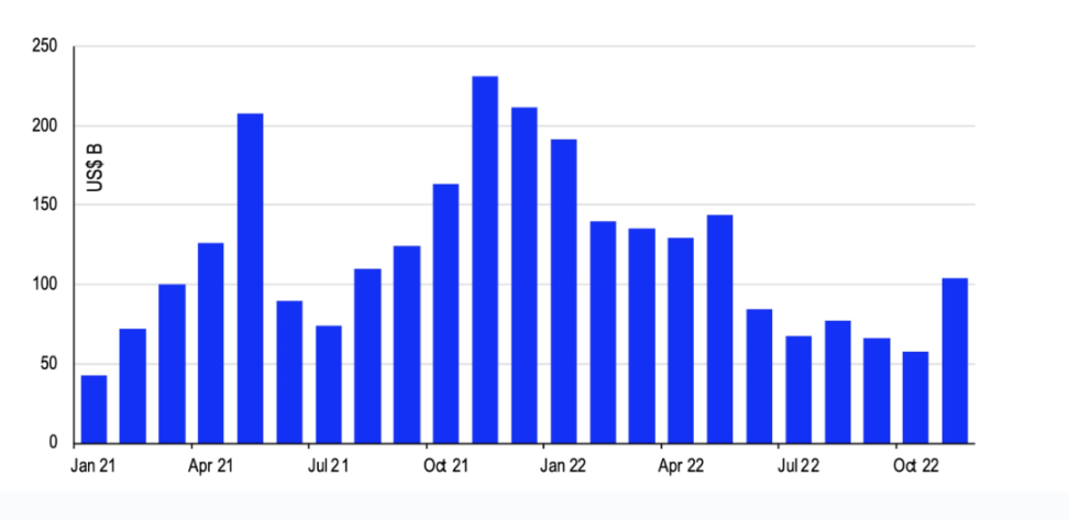 由于利率上升、高通胀以及股票收益疲软的原因,机构投资者已经在 2022 年下半年缩减了对大多数风险资产的资本配置。即使在假设美国未来的衰退可能是温和的情况下,这种紧缩仍在发生。对衰退时间的预期从 2023 年第二季度初持续到 2024 年第一季度,因为刺激计划支持的储备缓冲以及仍然有相当数量的职位空缺加强了经济数据。