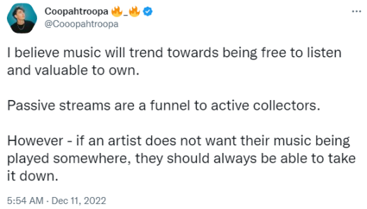 但是然后终于有人回过味来,说“我懂 free to listen,但是我不想让你收录我啊。你凭啥拿我的歌赚流量,也不给我钱?”