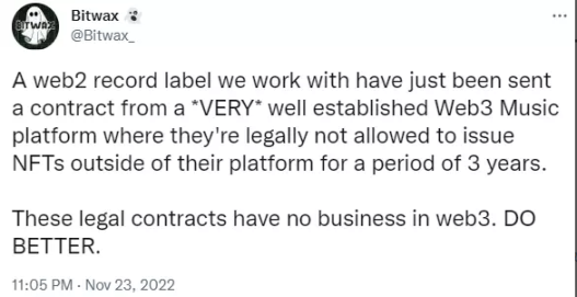 说有个顶流 Web3 音乐平台,居然向传统唱片公司发出了强硬的合同,看似邀请对方来发 NFT,实则排他性地要求“来都来了,卖身给我吧,三年不许在别处发 NFT 哦”