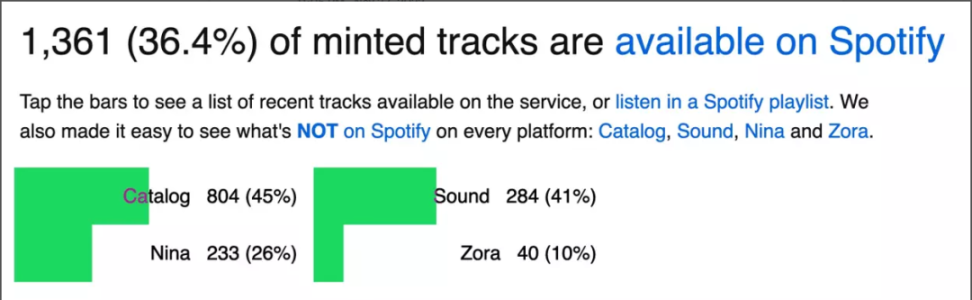 Anthony 前阵子在 Future Tape 上搞了个数据面板,专门追踪 Catalog、Sound、Zora 还有 Nina 这几个音乐 NFT 平台上铸造出来的歌曲有多少最终跑到了 Spotify 上,截至目前为止,总体上大约是三分之一左右。
