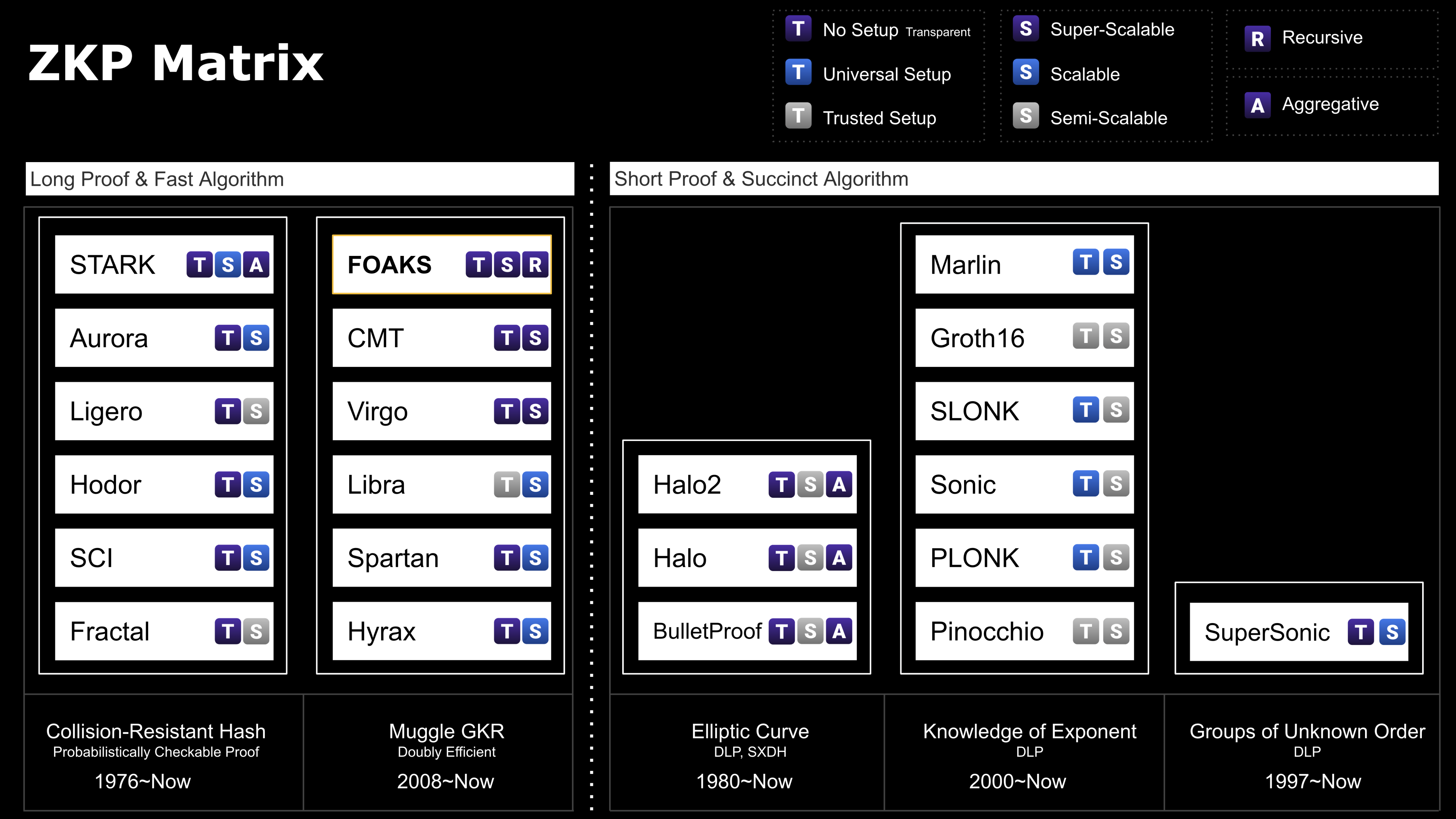 在算法效率方面,不同零知识证明使用不同的方法表达要证明的电路、且背后基于不同的数学困难问题,这些因素都会影响算法的各项效率。具体而言,一个零知识证明算法重要的效率指标包含证明大小、证明时间、验证时间等等,而在目前,大量的算法都能实现较短的验证时间,各式的聚合技术也可以压缩证明大小,而证明时间则是主要的瓶颈。