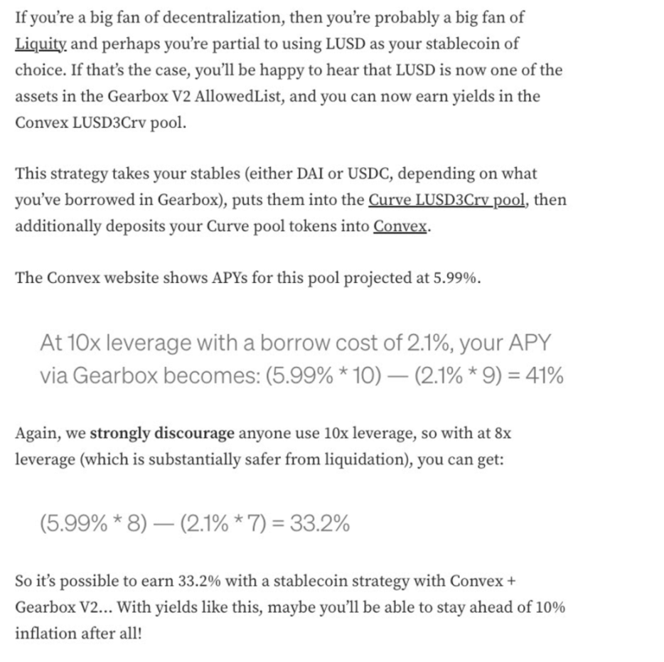 The full announcement description for V2 is a long but excellent read. It addresses how Gearbox managed to provide 10x on-chain leverage in a relatively safe manner. The basic mechanism is to limit the playing field to a known set of tokens that are known to be volatile. By focusing on some commonly used leveraged DeFi products, GEAR believes that its product safety can be guaranteed. For example, stablecoins tend to trade within tight ranges if they are functioning properly. If you expect stablecoins to indeed be close to the peg, these coins are relatively less risky.