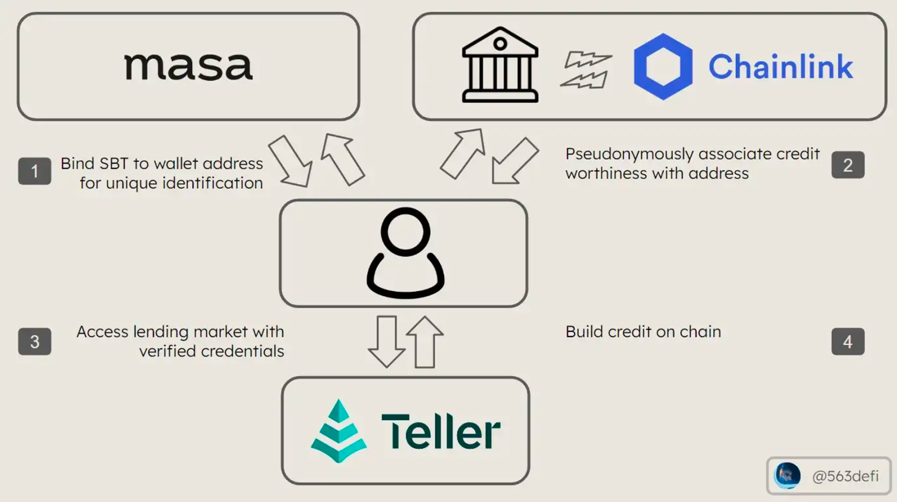 The user logs into his or her bank/other financial institution to prove their creditworthiness. Credit information is passed through Chainlink’s DECO Prover, where a zero-knowledge proof (ZKP) is generated to prove that credit reaches a certain threshold. ZKP is bound to the user’s SBT to uniquely identify the user’s wallet.