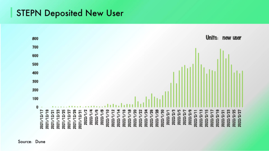 Referring to Dune data, we selected the data of new StepN users from last December to mid March. The new users of StepN did not show exponential growth before March (StepN gets listed on Binance on March 2), but maintained a steady upward trend. In the whole February, the net number of new addresses per day was 400+, an increase of 800% compared with the 50+ new daily addresses in January. Although there are various problems in StepN’s initial stage, the user retention rate has been maintained at a high level. Since players get NFT through community quiz activities, there was no pay back pressure, and even if the process of constant optimization would damage a certain revenue, players who get free sneakers didn’t care too much either.
