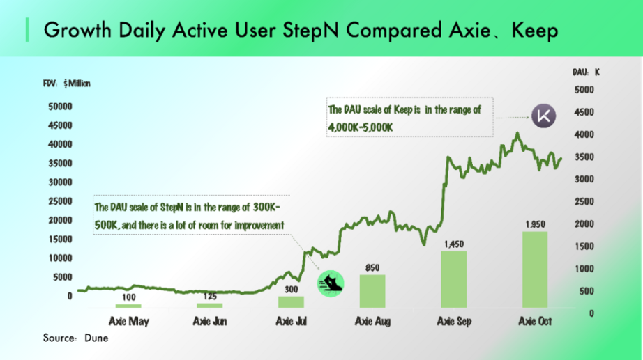 Entrepreneurs with long-term vision, correct blue ocean track, appropriate operation model and stable high-quality users, these attributes were not possessed by most GameFi projects at that time. Turning back to February, I shall applaud the institutions that fund StepN, this is a very good innovation and it’s even incredible that a “Move to Earn” GameFi without a guild would be as successful as it is. At present, the DAU of StepN is about 50W, which left room of three times for improvement compared to Axie Infinity’s highest million DAU.
