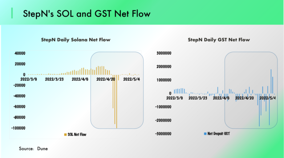 Observing the changes in the net inflows of GST and SOL from the capital side, after March, the Ponzi model has a tendency to weaken. And this tendency became more obvious in April. GST continued to flow out, and the influx of speculative users increased the pressure of fund withdrawal on the economic system. We see that recently the team is frequently adjusting the consumption mechanism to control the real output of GST, so as to guide the capital flow within the system. From an economic point of view, sneakers are still a game asset with unlimited interest-bearing capacity, causing excessive inflation in the economic system, and more importantly this problem cannot be simply solved by adjusting the output ratio. Therefore, in the long run, StepN will certainly modify the token model, otherwise, once the inflow of funds is suspended, the ecological stability will be difficult to maintain.