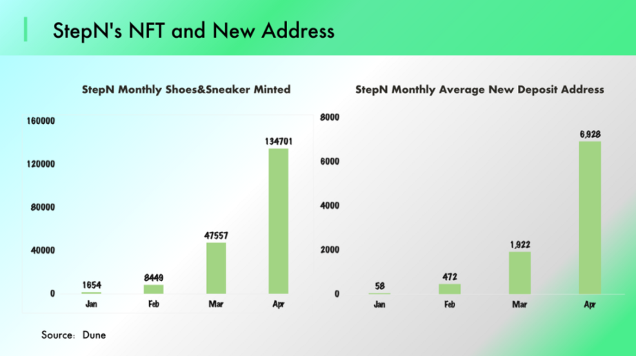 From the inflow side: the number of NFT minting and new users increased in the same proportion: the average daily new addresses of StepN was 1922 in March and 6927 in April, an increase of 360%; while the number of NFT sneakers increased by 283%. The growth rate of new users is in the same range as that of NFT sneakers. User growth is strong and NFT supply is limited. From the perspective of capital inflow, StepN’s Ponzi is in a very healthy stage. If this trend can continue, the ecosystem will remain quite resilient.