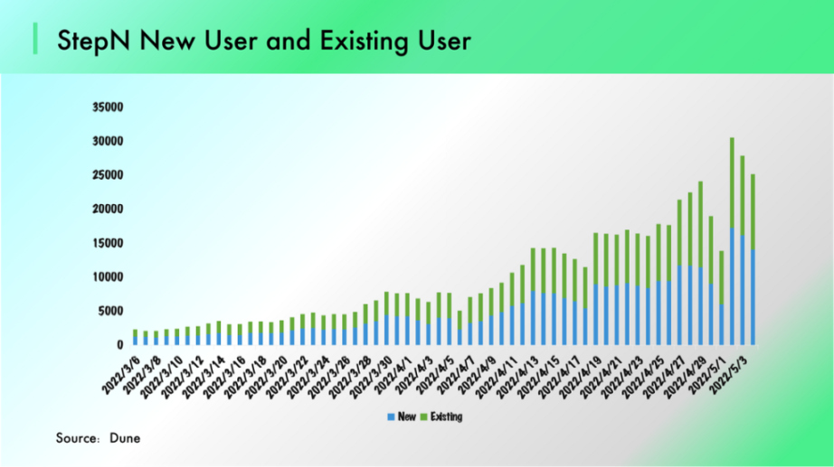The launch of the rental system may increase the burden on the ecosystem: StepN still has no rental system. According to the data of Magic Eden trading platform, the current floor price of StepN sneaker is about 13 SOL, which is around 1248 US dollars, causing a relatively high threshold for potential users to participate in. The rental system can allow players to participate at a lower cost, reduce the participation threshold and promote community expansion. At the same time, it is also a double-edged sword — the flow it brings to the ecosystem is more income oriented. The reason is simple: users participating in the game in rental mode need to pay for a fixed cost, so the return is necessary for the these users. The rental system redistributes the investment income among different types of users: NFT holders get the rental income, and borrowers get running income, each party is taking advantages from the ecosystem. In short, for the protocol, the rental system is to obtain the growth of users and the expansion of the community with economic benefits. Dune data show that the new users of StepN are still expanding steadily, and the early launch of the rental system is more than worth the loss for StepN.