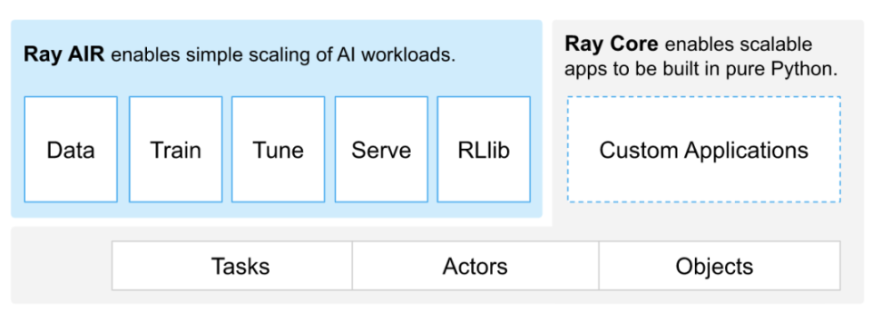 Ray 由一个核心的分布式计算架构(Ray Core)和一个用于简化 ML 计算的工具库(Ray AIR)组成,工具库包含了针对 Data、Train 等多个环节的工具和服务。