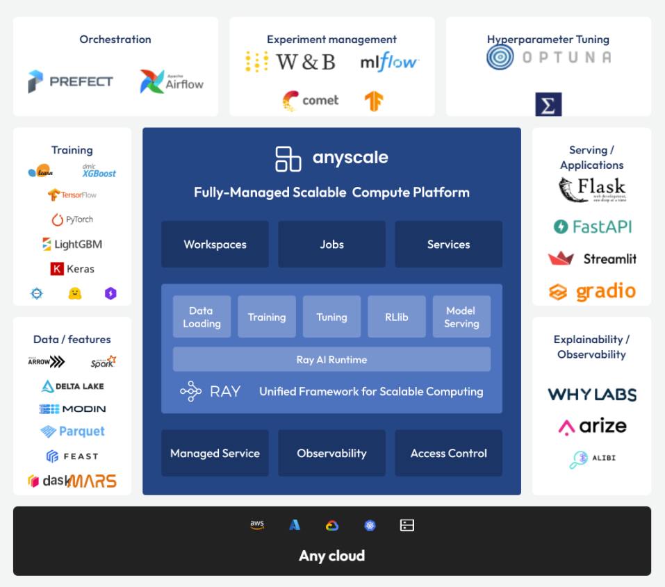 Anyscale 是基于 Ray 的云托管平台,也是公司的商业化产品。Anyscale 在 Ray 的基础上添加了不少 features 和服务,如可观测性、访问控制等等,目前还在探索数据安全等 value-add。