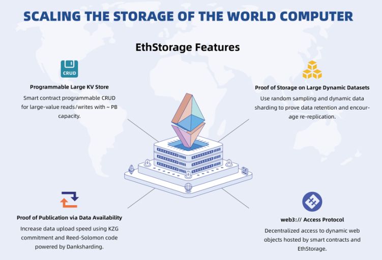 EthStorage 是基于以太坊数据可用(Data Availability)的基础上提供可编程的动态存储的二层解决方案(L2)。EthStorage 将会大大降低以太坊上大量数据的存储开销,节省 100 到 1000 倍成本,更好的支持未来完全去中心化的网络。 EthStorage 与 EVM 高度整合,并完全兼容 Solidity、Remix、Hardhat 和 MetaMask 等以太坊工具。 团队获得了以太坊基金会官方对于数据可用(Data Availability)研究的资助。