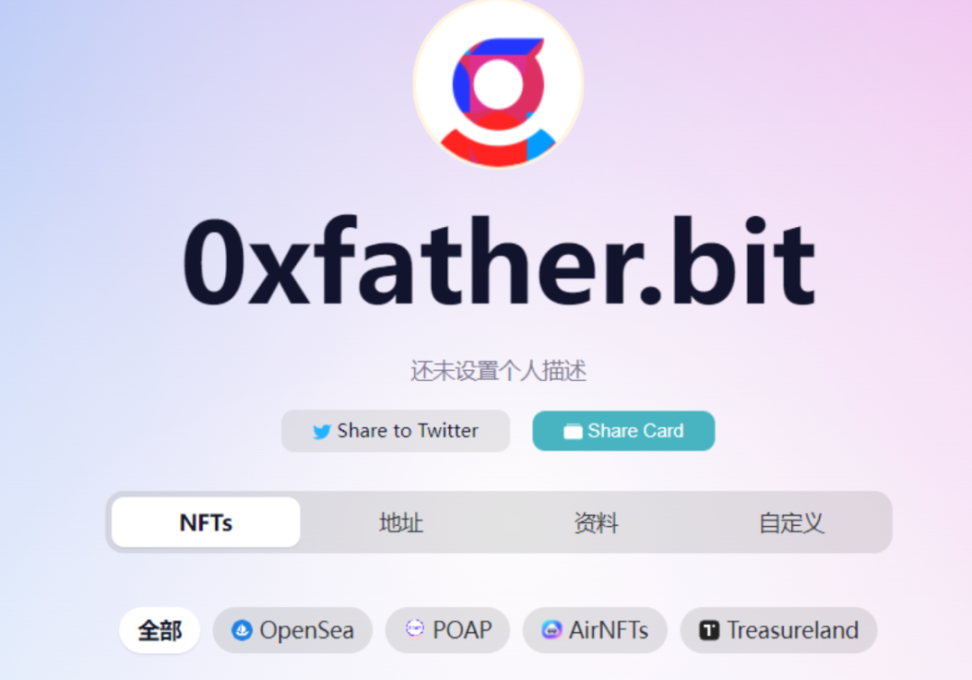 .bit 不仅是一个 DID 账户,同时也可以作为一个跨链资产聚合器,拥有.bit 账户的同时,也自动拥有 .bit.host 和 .bit.cc,如您拥有了 0xfather.bit,您同时也拥有 0xfather.bit.host 和 0xfather.bit.cc 这两个域名地址,您将可以通过他们来查看您的公链资产。另外 .bit 已实现 NFT、POAP、.bit 账号、公链地址等内容的集成,拥有一个. bit 账号,您就相当于拥有了一个跨链跨资源的专属身份名片.