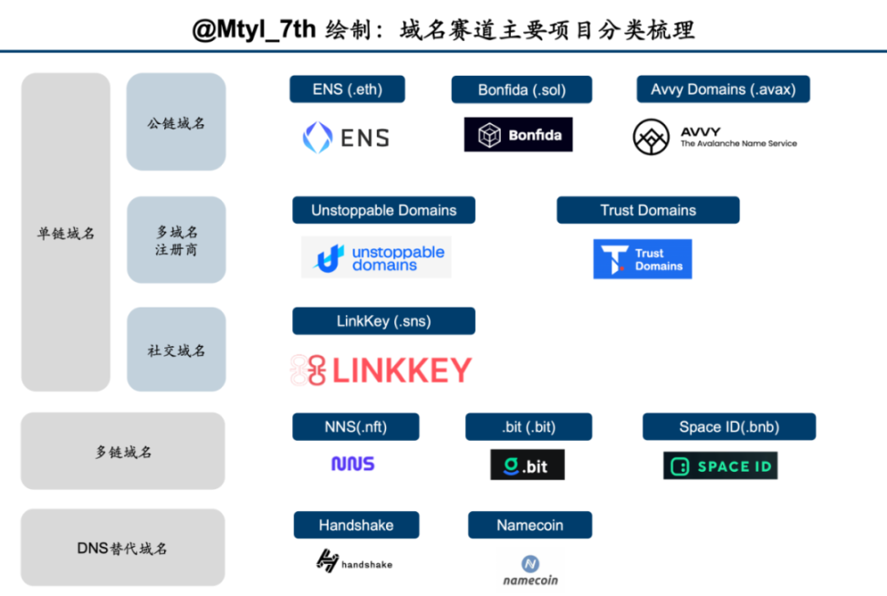 将当前的域名项目划为以下三类:单链域名、多链域名、DNS 替代类域名。其中单链域名又可以进一步细化。如下图所示: